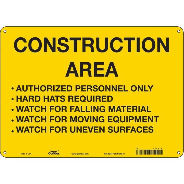 Safety Sign, Horizontal Rectangle, Number of Printed Sides 1, English, Sign Format Other Format, Sign Legend Construction Area Authorized Personnel Only Hard Hats Required Watch For Falling Material Watch For Moving Equipment Watch For Uneven Surfaces, Sign Legend Background Color Yellow, Sign Legend Style Text
