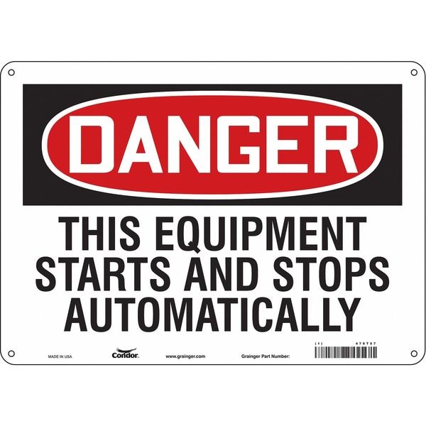 Safety Sign, Horizontal Rectangle, Number of Printed Sides 1, English, Sign Format Traditional OSHA, Sign Legend This Equipment Starts And Stops Automatically, Sign Legend Background Color White, Sign Legend Style Text