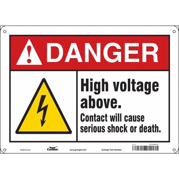 Safety Sign, Horizontal Rectangle, Number of Printed Sides 1, English, Sign Format ANSI/OSHA Format, Sign Legend High Voltage Above. Contact Will Cause Serious Shock Or Death., Sign Legend Background Color White, Sign Legend Style Symbol and Text