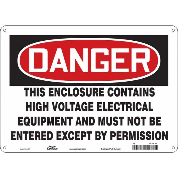 Safety Sign, Horizontal Rectangle, Number of Printed Sides 1, English, Sign Format Traditional OSHA, Sign Legend This Enclosure Contains High Voltage Electrical Equipment And Must Not Be Entered Except By Permission, Sign Legend Background Color White, Sign Legend Style Text