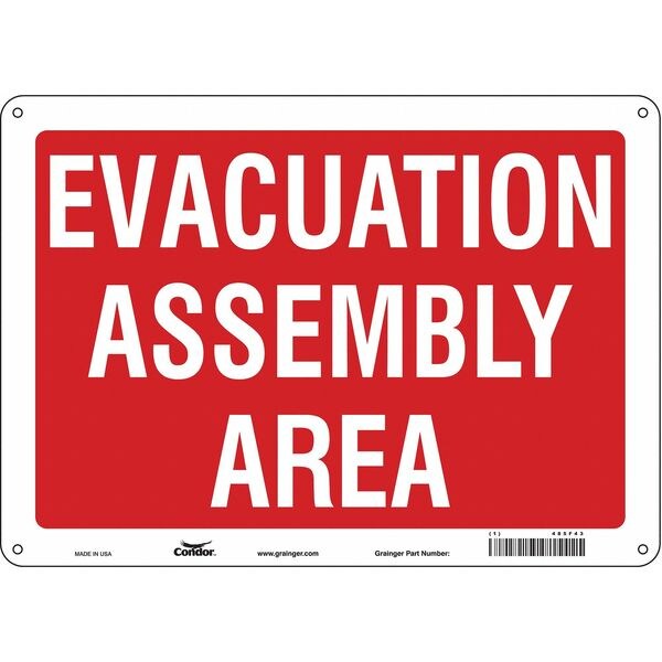 Safety Sign, Horizontal Rectangle, Number of Printed Sides 1, English, Sign Legend Evacuation Assembly Area, Sign Legend Background Color Red, Sign Legend Style Text