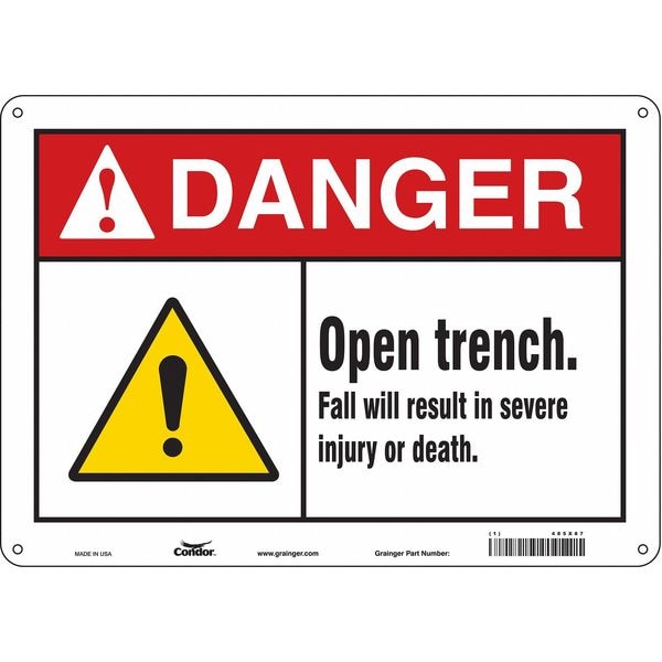 Safety Sign, Horizontal Rectangle, Number of Printed Sides 1, English, Sign Format ANSI/OSHA Format, Sign Legend Open Trench. Fall Will Result In Severe Injury Or Death., Sign Legend Background Color White, Sign Legend Style Symbol and Text