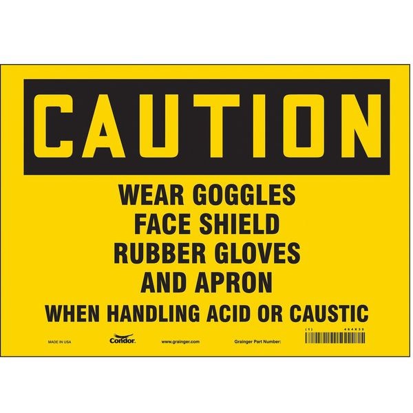 Safety Sign, Horizontal Rectangle, Number of Printed Sides 1, English, Sign Format Traditional OSHA, Sign Legend Wear Goggles Face Shield Rubber Gloves And Apron When Handling Acid Or Caustic, Sign Legend Background Color Yellow, Sign Legend Style Text