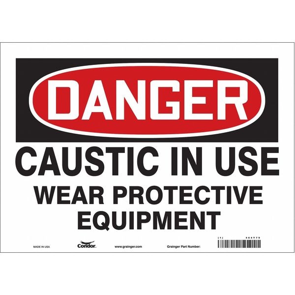 Safety Sign, Horizontal Rectangle, Number of Printed Sides 1, English, Sign Format Traditional OSHA, Sign Legend Caustic In Use Wear Protective Equipment, Sign Legend Background Color White, Sign Legend Style Text
