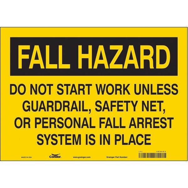 Safety Sign, Horizontal Rectangle, Number of Printed Sides 1, English, Sign Format Other Format, Sign Legend Fall Hazard Do Not Start Work Unless Guardrail, Safety Net, Or Personal Fall Arrest System Is In Place, Sign Legend Background Color Black, Yellow, Sign Legend Style Text