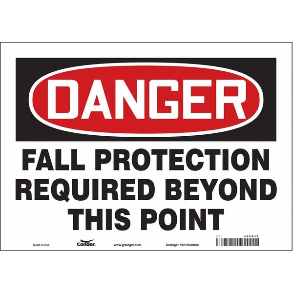 Safety Sign, Horizontal Rectangle, Number of Printed Sides 1, English, Sign Format Traditional OSHA, Sign Legend Fall Protection Required Beyond This Point, Sign Legend Background Color White, Sign Legend Style Text