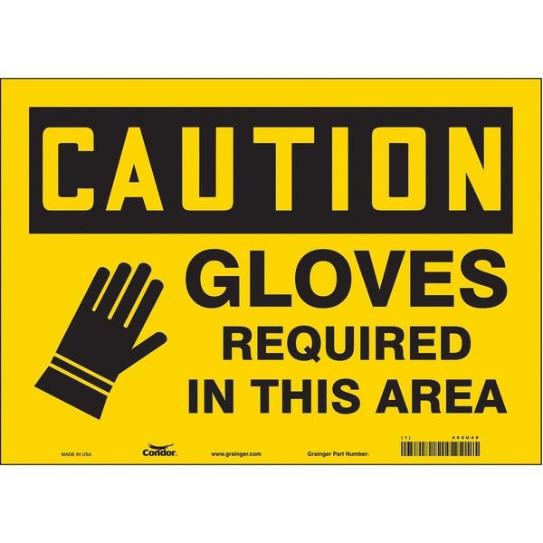 Safety Sign, Horizontal Rectangle, Number of Printed Sides 1, English, Sign Format Traditional OSHA, Sign Legend Gloves Required In This Area, Sign Legend Background Color Yellow, Sign Legend Style Symbol and Text