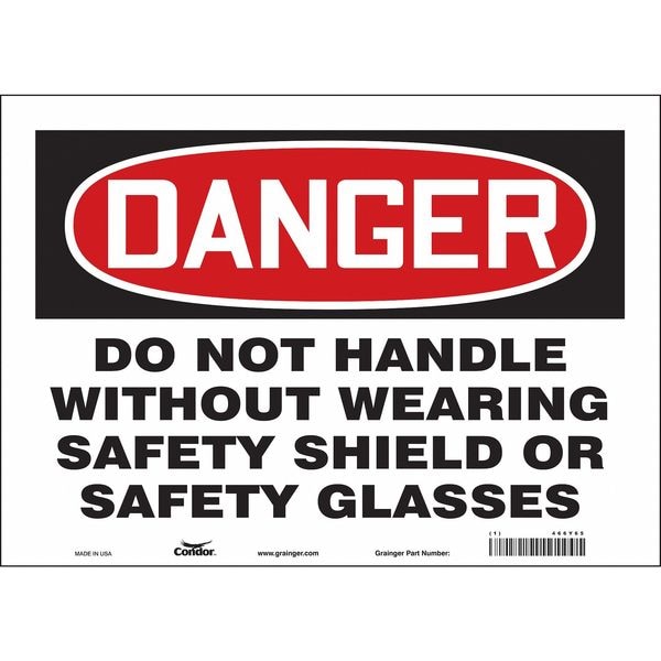Safety Sign, Horizontal Rectangle, Number of Printed Sides 1, English, Sign Format Traditional OSHA, Sign Legend Do Not Handle Without Wearing Safety Shield Or Safety Glasses, Sign Legend Background Color White, Sign Legend Style Text