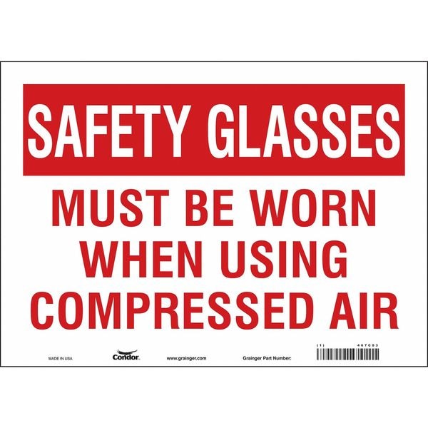 Safety Sign, Horizontal Rectangle, Number of Printed Sides 1, English, Sign Format Other Format, Sign Legend Safety Glasses Must Be Worn When Using Compressed Air, Sign Legend Background Color Red, White, Sign Legend Style Text