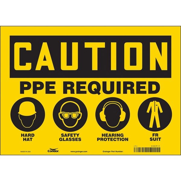 Safety Sign, Horizontal Rectangle, Number of Printed Sides 1, English, Sign Format Traditional OSHA, Sign Legend Ppe Required Hard Hat Safety Glasses Hearing Protection Fr Suit, Sign Legend Background Color Yellow, Sign Legend Style Symbol and Text