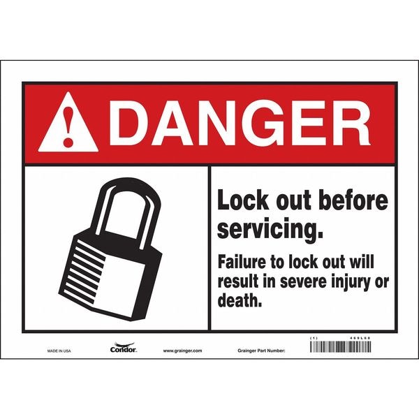 Safety Sign, Horizontal Rectangle, Number of Printed Sides 1, English, Sign Format ANSI/OSHA Format, Sign Legend Lock Out Before Servicing. Failure To Lock Out Will Result In Severe Injury Or Death., Sign Legend Background Color White, Sign Legend Style Symbol and Text