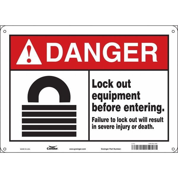 Safety Sign, Horizontal Rectangle, Number of Printed Sides 1, English, Sign Format ANSI/OSHA Format, Sign Legend Lock Out Equipment Before Entering. Failure To Lock Out Will Result In Severe Injury Or Death., Sign Legend Background Color White, Sign Legend Style Symbol and Text