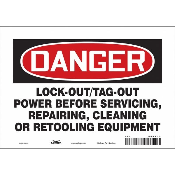 Safety Sign, Horizontal Rectangle, Number of Printed Sides 1, English, Sign Format Traditional OSHA, Sign Legend Lock-Out/Tag-Out Power Before Servicing, Repairing, Cleaning Or Retooling Equipment, Sign Legend Background Color White, Sign Legend Style Text