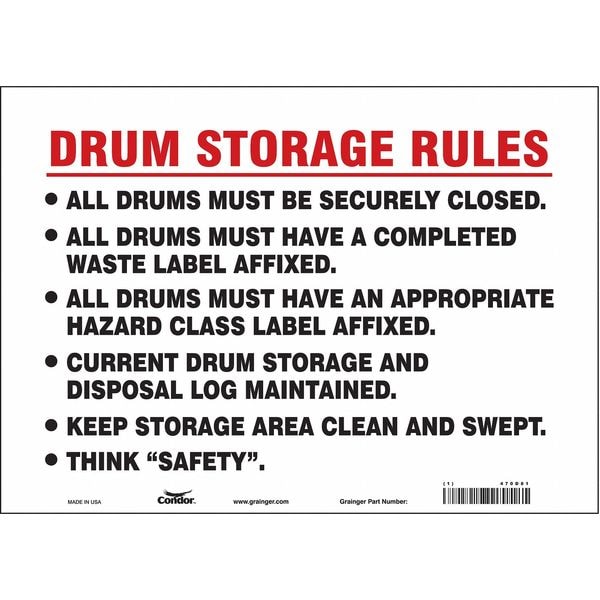 Safety Sign, Horizontal Rectangle, Number of Printed Sides 1, English, Sign Format Other Format, Sign Legend Drum Storage Rules All Drums Must Be Securely Closed. All Drums Must Have A Completed Waste Label Affixed. All Drums Must Have An Appropriate Hazard Class Label Affixed. Current Drum Storage And Disposal Log Maintained. Keep Storage Area Clean And Swept., Sign Legend Background Color White, Sign Legend Style Text