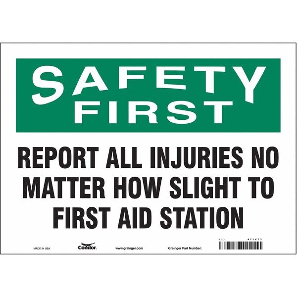 Safety Sign, Horizontal Rectangle, Number of Printed Sides 1, English, Sign Format Traditional OSHA, Sign Legend Report All Injuries No Matter How Slight To First Aid Station, Sign Legend Background Color White, Sign Legend Style Text