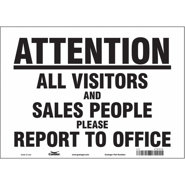 Safety Sign, Horizontal Rectangle, Number of Printed Sides 1, English, Sign Format Other Format, Sign Legend Attention All Visitors And Sales People Please Report To Office, Sign Legend Background Color White, Sign Legend Style Text