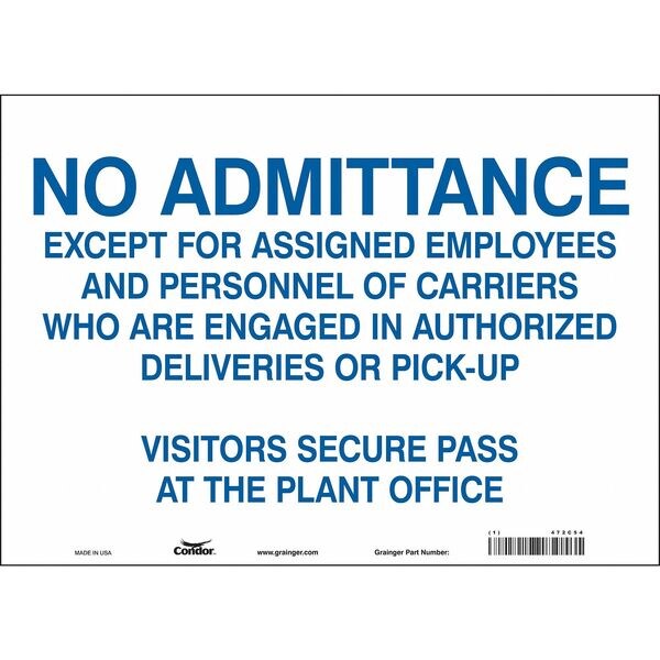 Safety Sign, Horizontal Rectangle, Number of Printed Sides 1, English, Sign Format Other Format, Sign Legend No Admittance Except For Assigned Employees And Personnel Of Carriers Who Are Engaged In Authorized Deliveries Or Pick-Up Visitors Secure Pass At The Plant Office, Sign Legend Background Color White, Sign Legend Style Text