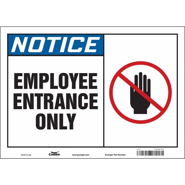 Safety Sign, Horizontal Rectangle, Number of Printed Sides 1, English, Sign Format ANSI/OSHA Format, Sign Legend Employee Entrance Only, Sign Legend Background Color White, Sign Legend Style Symbol and Text