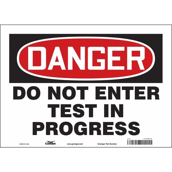 Safety Sign, Horizontal Rectangle, Number of Printed Sides 1, English, Sign Format Traditional OSHA, Sign Legend Do Not Enter Test In Progress, Sign Legend Background Color White, Sign Legend Style Text