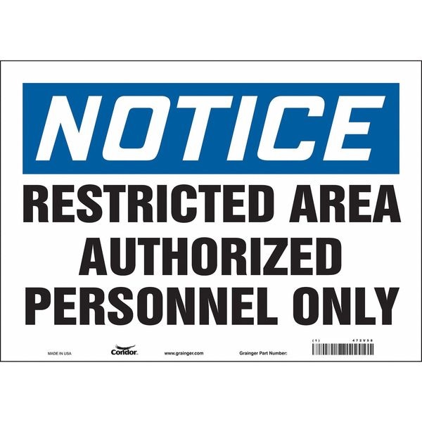 Safety Sign, Horizontal Rectangle, Number of Printed Sides 1, English, Sign Format Traditional OSHA, Sign Legend Restricted Area Authorized Personnel Only, Sign Legend Background Color White, Sign Legend Style Text