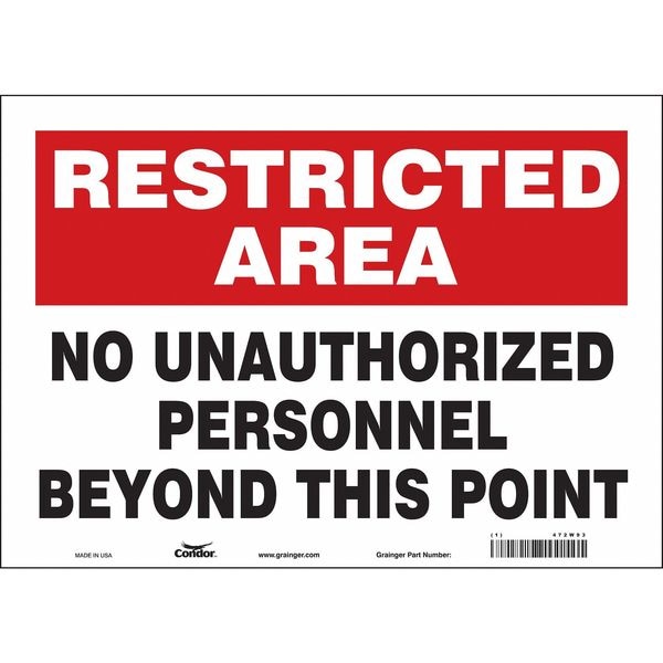 Safety Sign, Horizontal Rectangle, Number of Printed Sides 1, English, Sign Format Other Format, Sign Legend No Unauthorized Personnel Beyond This Point, Sign Legend Background Color Red, White, Sign Legend Style Text