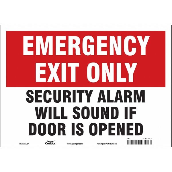 Safety Sign, Horizontal Rectangle, Number of Printed Sides 1, English, Sign Legend Security Alarm Will Sound If Door Is Opened, Sign Legend Background Color Red, White, Sign Legend Style Text