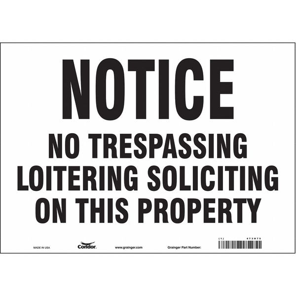 Safety Sign, Horizontal Rectangle, Number of Printed Sides 1, English, Sign Format Other Format, Sign Legend No Trespassing Loitering Soliciting On This Property, Sign Legend Background Color White, Sign Legend Style Text