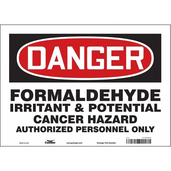 Safety Sign, Horizontal Rectangle, Number of Printed Sides 1, English, Sign Format Traditional OSHA, Sign Legend Formaldehyde Irritant & Potential Cancer Hazard Authorized Personnel Only, Sign Legend Background Color White, Sign Legend Style Text