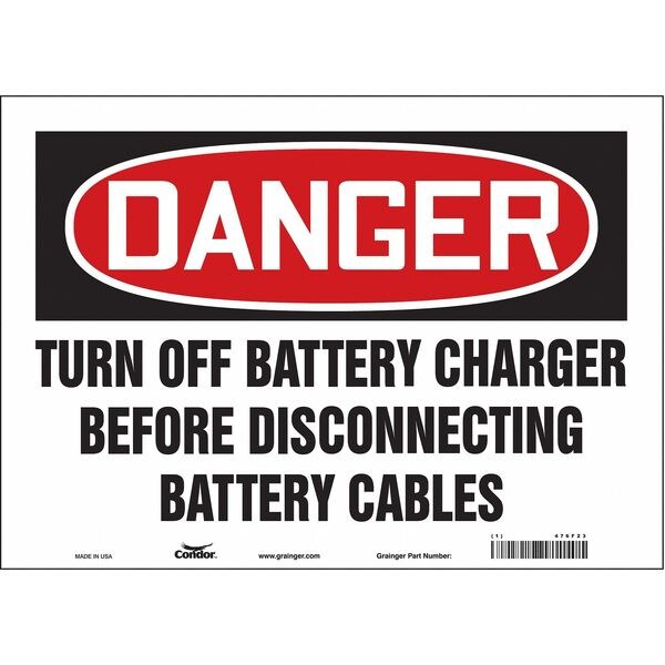 Safety Sign, Horizontal Rectangle, Number of Printed Sides 1, English, Sign Format Traditional OSHA, Sign Legend Turn Off Battery Charger Before Disconnecting Battery Cables, Sign Legend Background Color White, Sign Legend Style Text