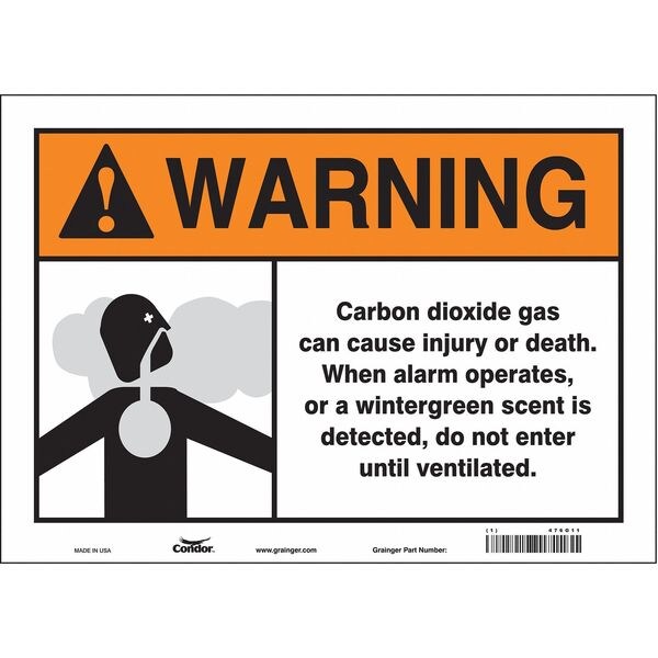 Safety Sign, Horizontal Rectangle, Number of Printed Sides 1, English, Sign Format ANSI/OSHA Format, Sign Legend Carbon Dioxide Gas Can Cause Injury Or Death. When Alarm Operates, Or A Wintergreen Scent Is Detected, Do Not Enter Until Ventilated., Sign Legend Background Color White, Sign Legend Style Symbol and Text