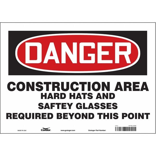 Safety Sign, Horizontal Rectangle, Number of Printed Sides 1, English, Sign Format Traditional OSHA, Sign Legend Construction Area Hard Hats And Safety Glasses Required Beyond This Point, Sign Legend Background Color White, Sign Legend Style Text