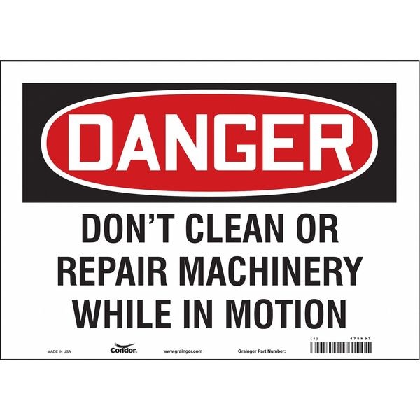 Safety Sign, Horizontal Rectangle, Number of Printed Sides 1, English, Sign Format Traditional OSHA, Sign Legend Don'T Clean Or Repair Machinery While In Motion, Sign Legend Background Color White, Sign Legend Style Text