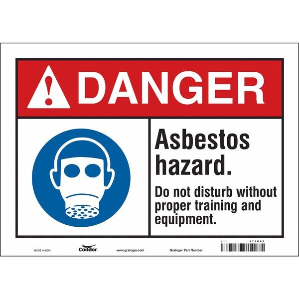 Safety Sign, Horizontal Rectangle, Number of Printed Sides 1, English, Sign Format ANSI/OSHA Format, Sign Legend Asbestos. Hazardous. Do Not Disturb Without Proper Training And Equipment., Sign Legend Background Color White, Sign Legend Style Symbol and Text