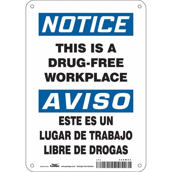 Safety Sign, Horizontal Rectangle, Number of Printed Sides 1, English, Sign Format Traditional OSHA, Sign Legend This Is A Drug-Free Workplace/Este Es Un Area De Trabajo Libre De Drogas, Sign Legend Background Color White, Sign Legend Style Text
