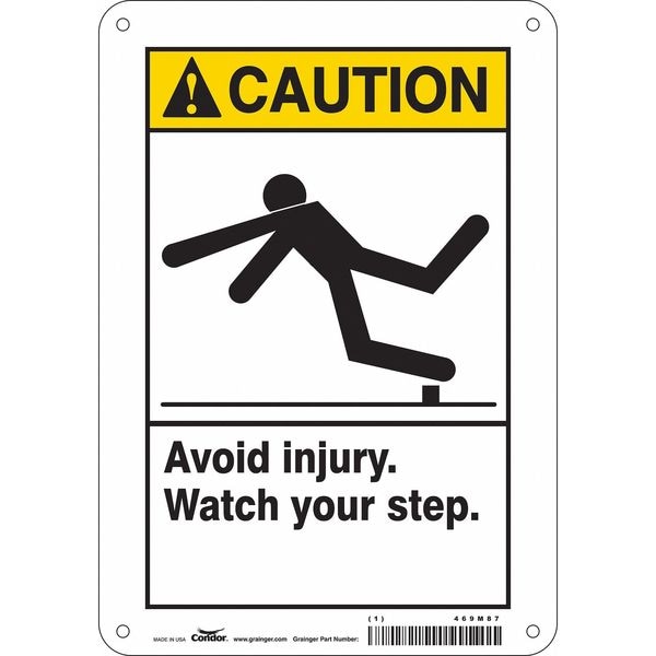 Safety Sign, Horizontal Rectangle, Number of Printed Sides 1, English, Sign Format ANSI/OSHA Format, Sign Legend Avoid Injury. Watch Your Step., Sign Legend Background Color White, Sign Legend Style Symbol and Text