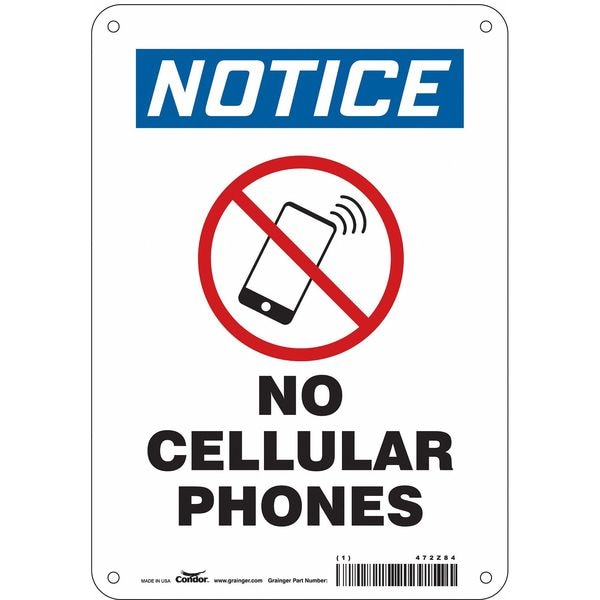 Safety Sign, Horizontal Rectangle, Number of Printed Sides 1, English, Sign Format Traditional OSHA, Sign Legend No Cellular Phones, Sign Legend Background Color White, Sign Legend Style Symbol and Text