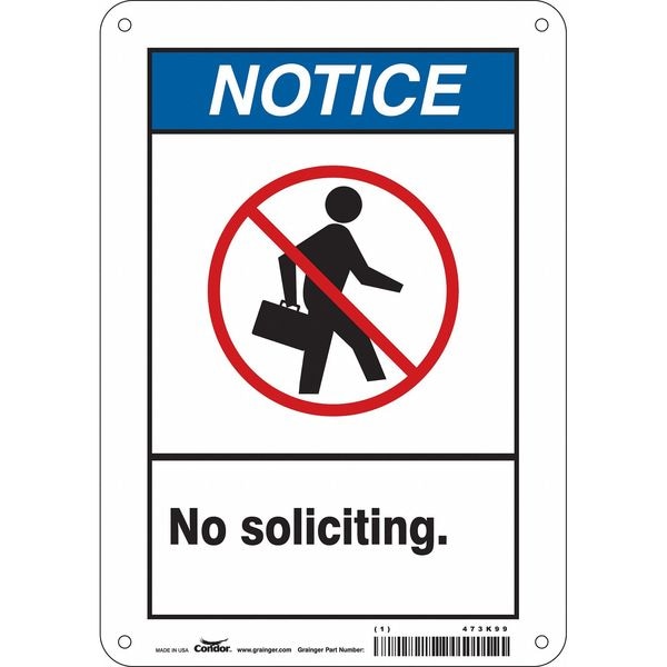 Safety Sign, Horizontal Rectangle, Number of Printed Sides 1, English, Sign Legend No Soliciting., Sign Legend Background Color White, Sign Legend Style Symbol and Text