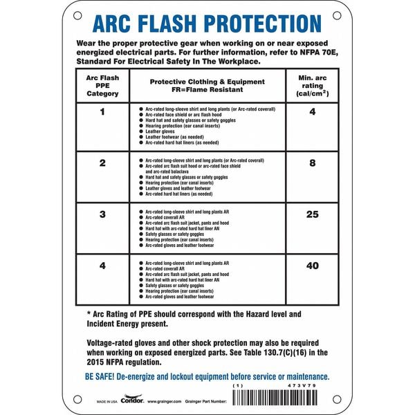 Safety Sign, Horizontal Rectangle, Number of Printed Sides 1, English, Sign Format Other Format, Sign Legend Arc Flash Protection Arc Flash Ppe Category Protective Clothing & Equipment Fr = Flame Resistant Min. Arc Rating (Cal/Cm2) Be Safe! De-Energize And Lockout Equipment Before Service Or Maintenance., Sign Legend Background Color White, Sign Legend Style Text
