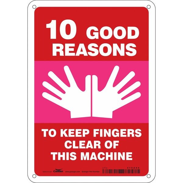 Safety Sign, Horizontal Rectangle, Number of Printed Sides 1, English, Sign Format Other Format, Sign Legend 10 Good Reasons To Keep Fingers Clear Off This Machine, Sign Legend Background Color Red, Sign Legend Style Symbol and Text