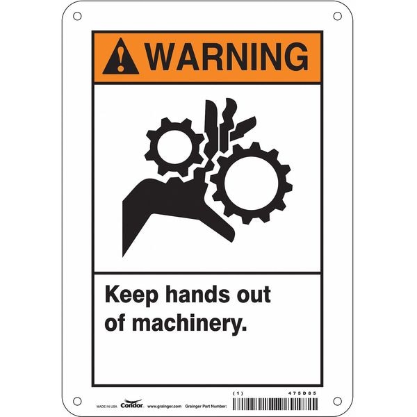Safety Sign, Horizontal Rectangle, Number of Printed Sides 1, English, Sign Format ANSI/OSHA Format, Sign Legend Keep Hands Out Of Machinery., Sign Legend Background Color White, Sign Legend Style Symbol and Text