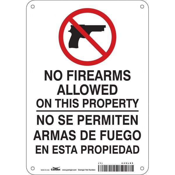 Safety Sign, Horizontal Rectangle, Number of Printed Sides 1, English, Spanish, Sign Legend No Firearms Allowed On This Property/No Se Permiten Armas De Fuego En Esta Propiedad, Sign Legend Background Color White, Sign Legend Style Symbol and Text