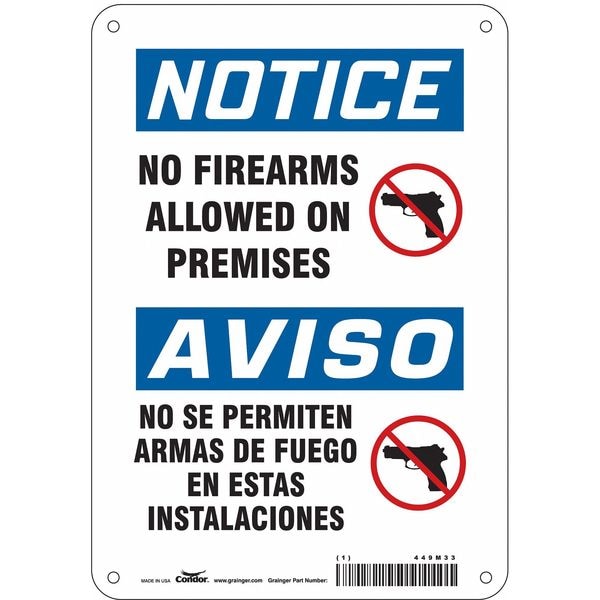 Safety Sign, Horizontal Rectangle, Number of Printed Sides 1, English, Sign Legend No Firearms Allowed On Premises/No Se Permiten Armas De Fuego En Estas Instalaciones, Sign Legend Background Color White, Sign Legend Style Symbol and Text