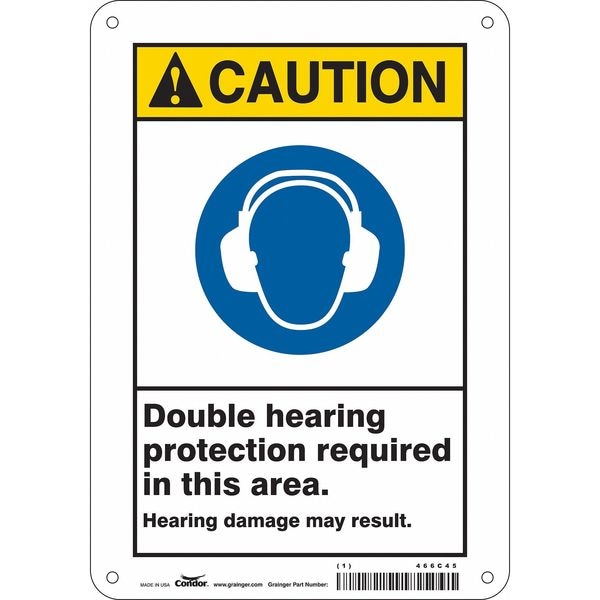 Safety Sign, Horizontal Rectangle, Number of Printed Sides 1, English, Sign Format ANSI/OSHA Format, Sign Legend Double Hearing Protection Required In This Area. Hearing Damage May Result., Sign Legend Background Color White, Sign Legend Style Symbol and Text