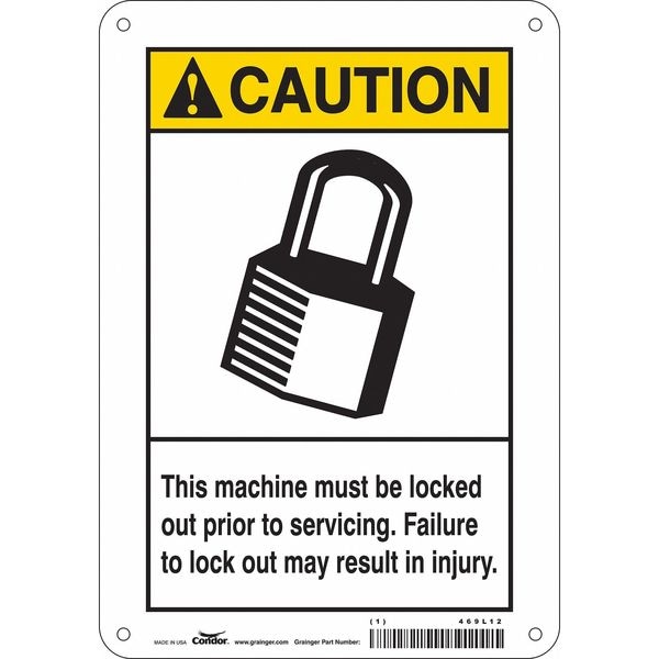 Safety Sign, Horizontal Rectangle, Number of Printed Sides 1, English, Sign Format ANSI/OSHA Format, Sign Legend This Machine Must Be Locked Out Prior To Servicing. Failure To Lock Out May Result In Injury., Sign Legend Background Color White, Sign Legend Style Symbol and Text