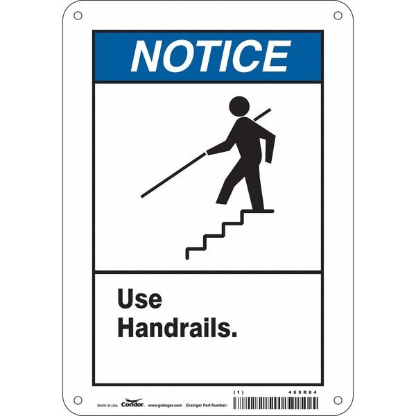 Safety Sign, Horizontal Rectangle, Number of Printed Sides 1, English, Sign Format ANSI/OSHA Format, Sign Legend Use Handrails., Sign Legend Background Color White, Sign Legend Style Symbol and Text