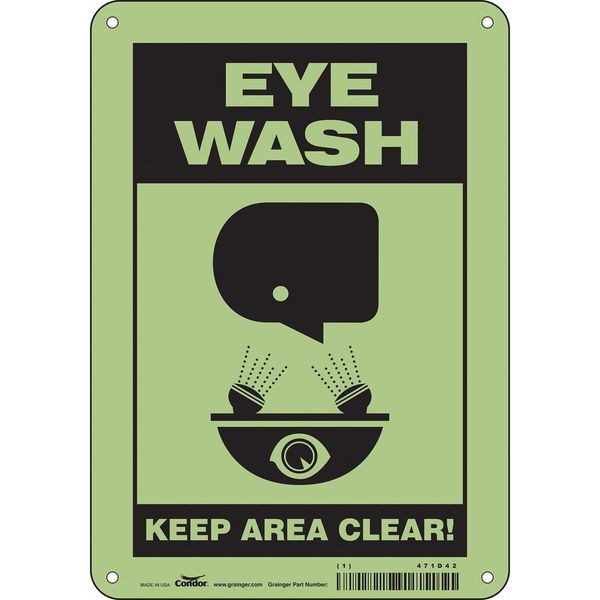 Safety Sign, Horizontal Rectangle, Number of Printed Sides 1, English, Sign Format Other Format, Sign Legend Eye Wash Keep Area Clear!, Sign Legend Background Color Black, Yellow, Sign Legend Style Symbol and Text