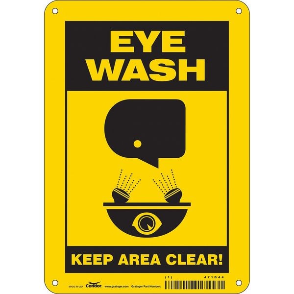 Safety Sign, Horizontal Rectangle, Number of Printed Sides 1, English, Sign Format Other Format, Sign Legend Eye Wash Keep Area Clear!, Sign Legend Background Color Black, Yellow, Sign Legend Style Symbol and Text