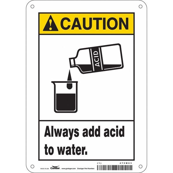 Safety Sign, Horizontal Rectangle, Number of Printed Sides 1, English, Sign Format ANSI/OSHA Format, Sign Legend Always Add Acid To Water., Sign Legend Background Color White, Sign Legend Style Symbol and Text