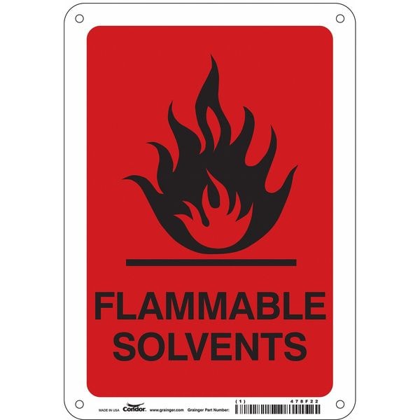 Safety Sign, Horizontal Rectangle, Number of Printed Sides 1, English, Sign Format Other Format, Sign Legend Flammable Solvents, Sign Legend Background Color Red, White, Sign Legend Style Symbol and Text