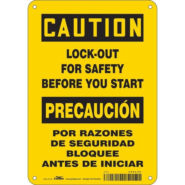 Safety Sign, Horizontal Rectangle, Number of Printed Sides 1, English, Spanish, Sign Format Traditional OSHA, Sign Legend Lock-Out For Safety Before You Start/Por Razones De Seguridad, Bloquee Antes De Iniciar, Sign Legend Background Color Yellow, Sign Legend Style Text